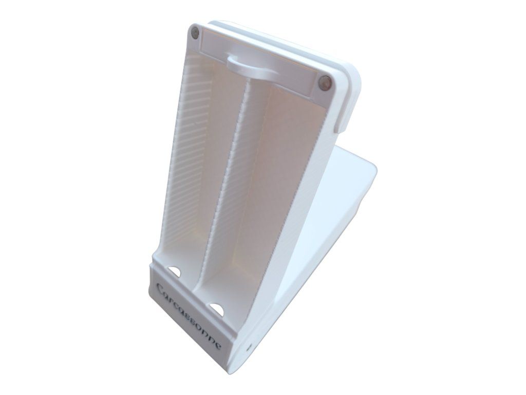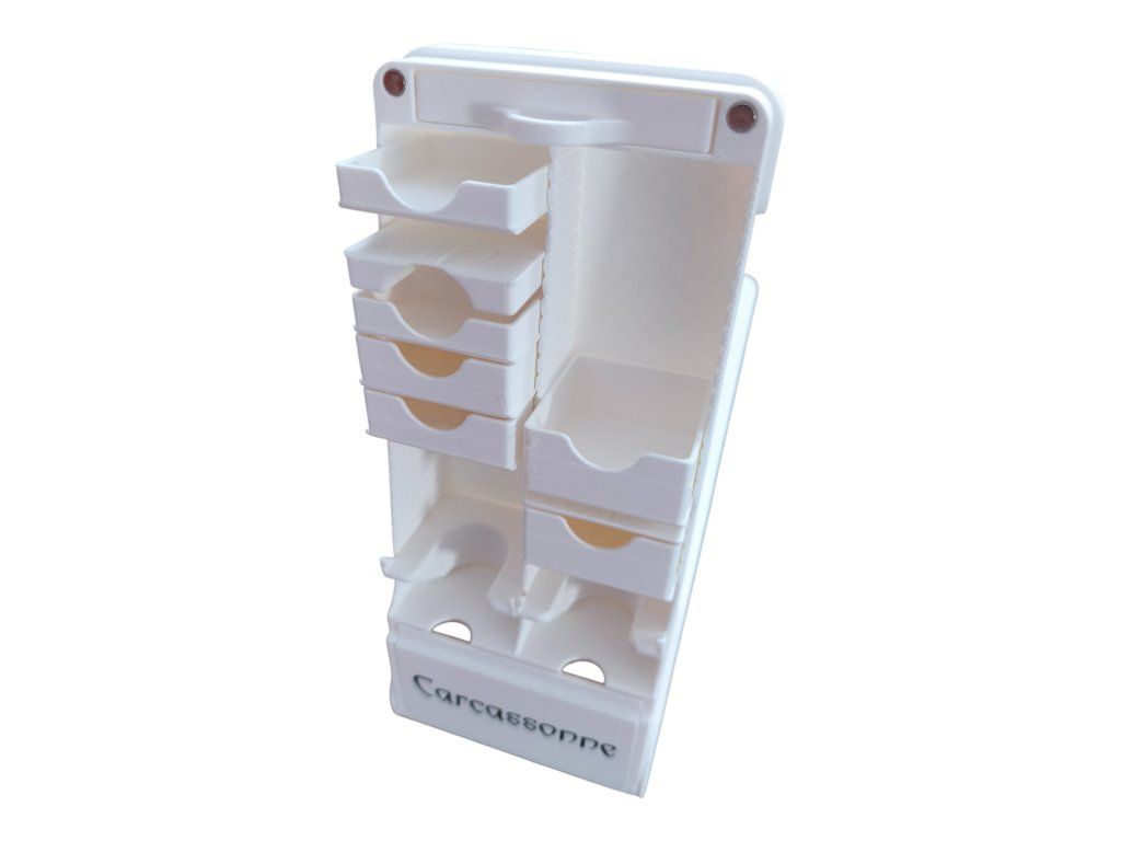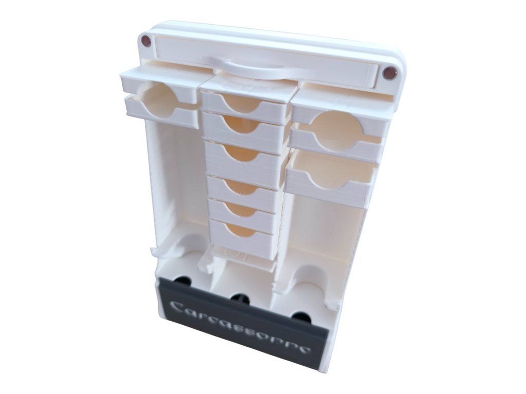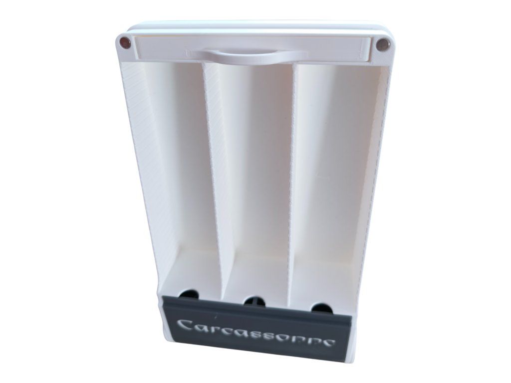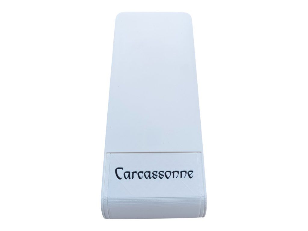 Praktický a promyšlený 3D tištěný box navržený pro pohodlné přenášení i hraní oblíbené hry Carcassonne včetně rozšíření. Vznikl jako řešení pro přehledné uložení velkého množství herních dílků a příslušenství, přičemž maximálně využívá každý milimetr prostoru.