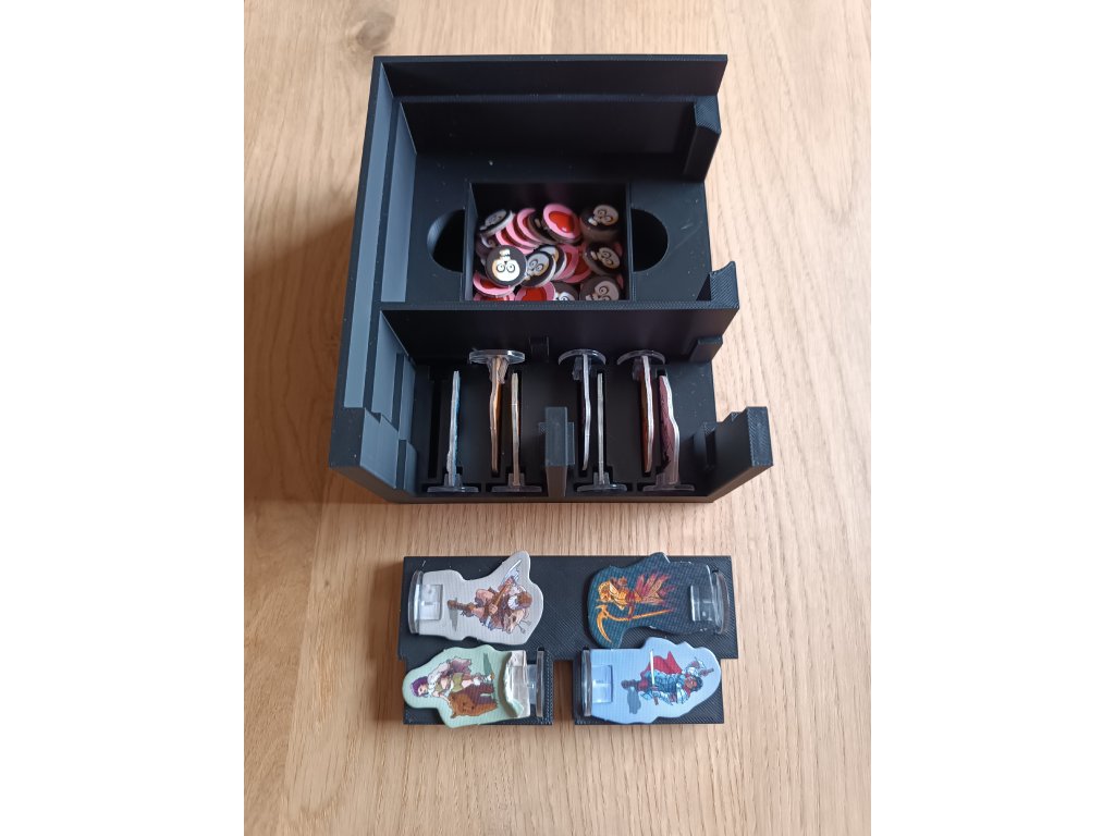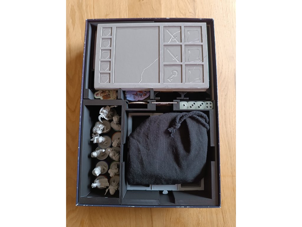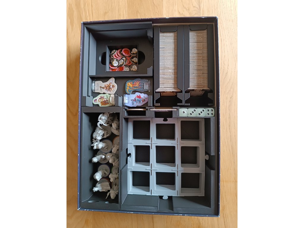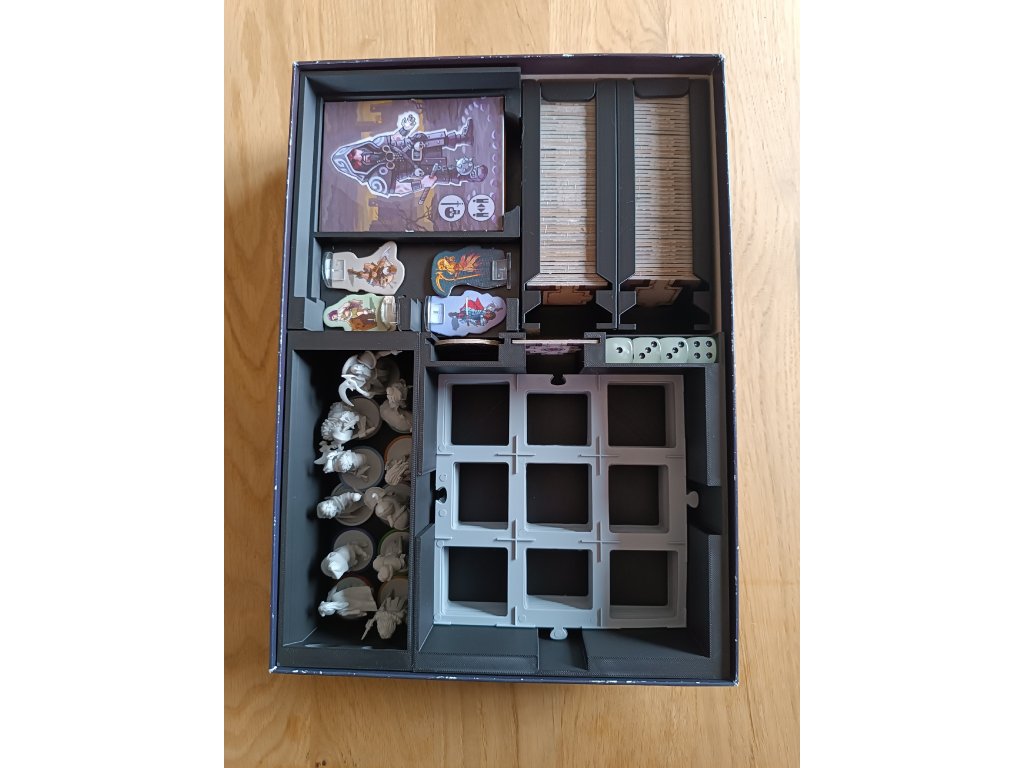 Balení neobsahuje: mřížky, žetony života a rozšíření inventáře, ale v insertu je možné skladovat hru jak základní, tak i s vylepšenými komponenty.