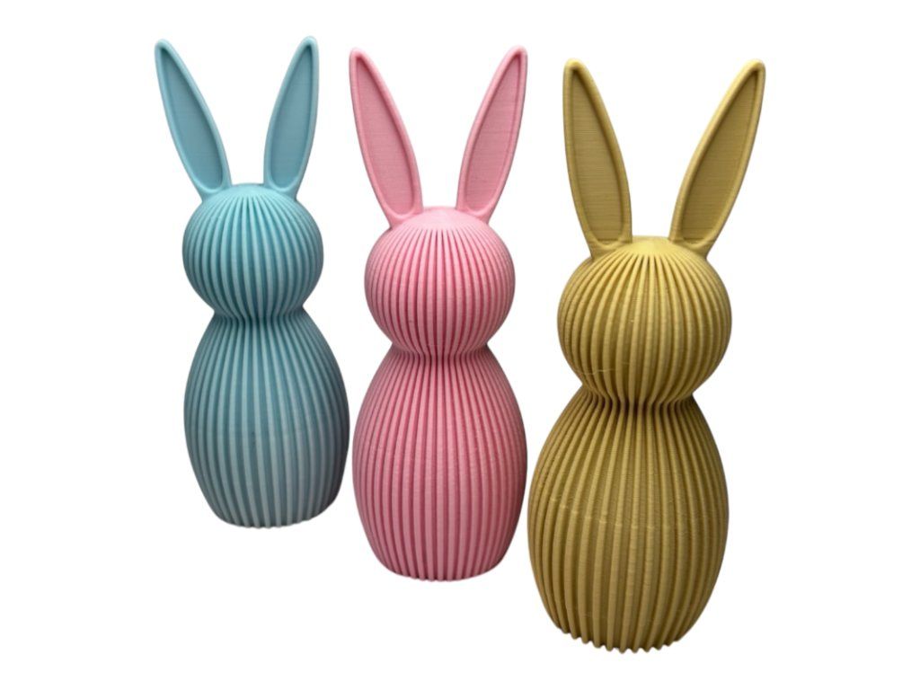 Originální velikonoční zajíc vytištěný na 3D tiskárně je stylová dekorace, která spojuje hravost svátků jara s moderním designem. Díky jemné vrstvené struktuře a elegantním tvarům působí současně minimalisticky i útulně – skvěle se hodí na poličku, komodu, parapet nebo jako součást sezónní výzdoby.