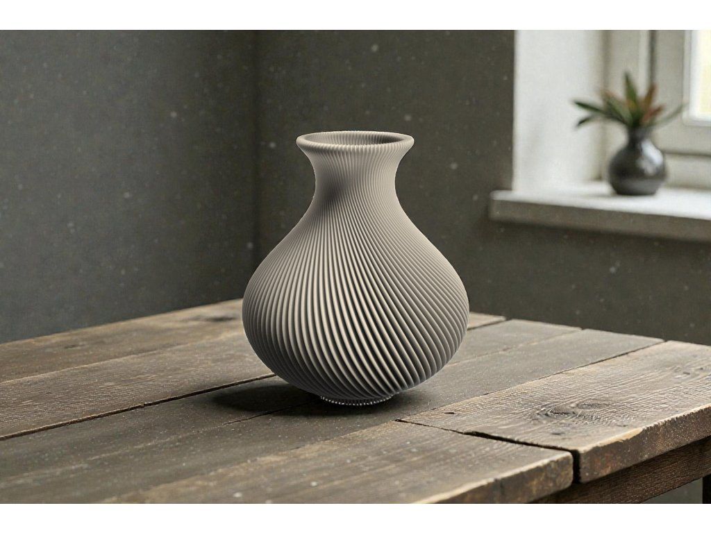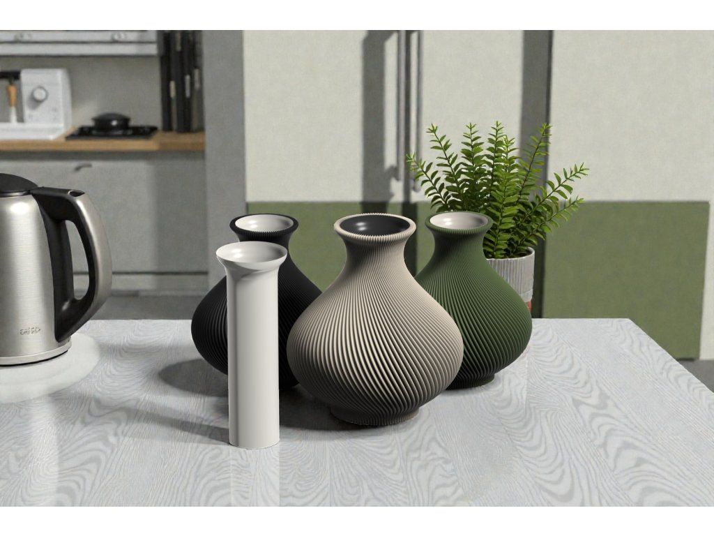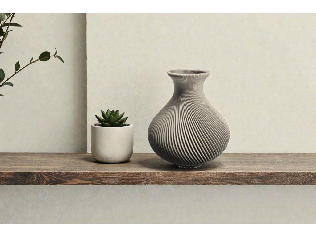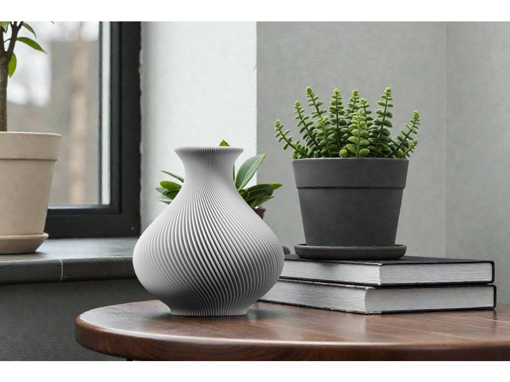 Váza je 3D tištěna z materiálu na bázi PLA – biologicky odbouratelného plastu z obnovitelných zdrojů.
